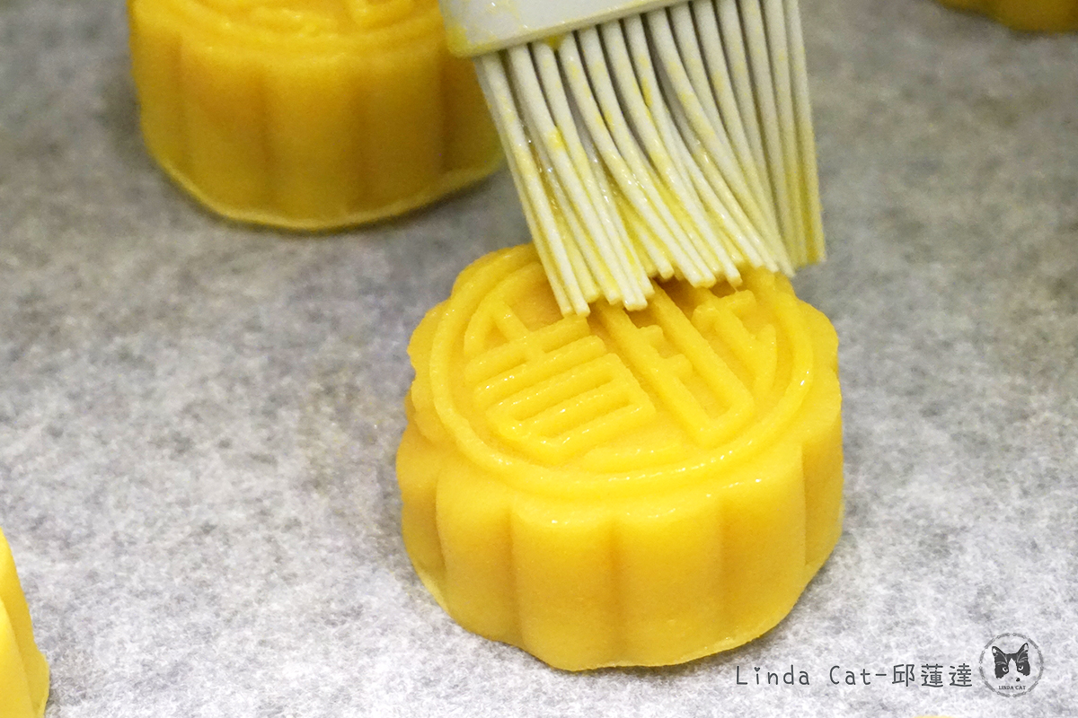 進入焗爐前,掃蛋漿的份量不多亦不少,才能焗出月餅應有的色澤。